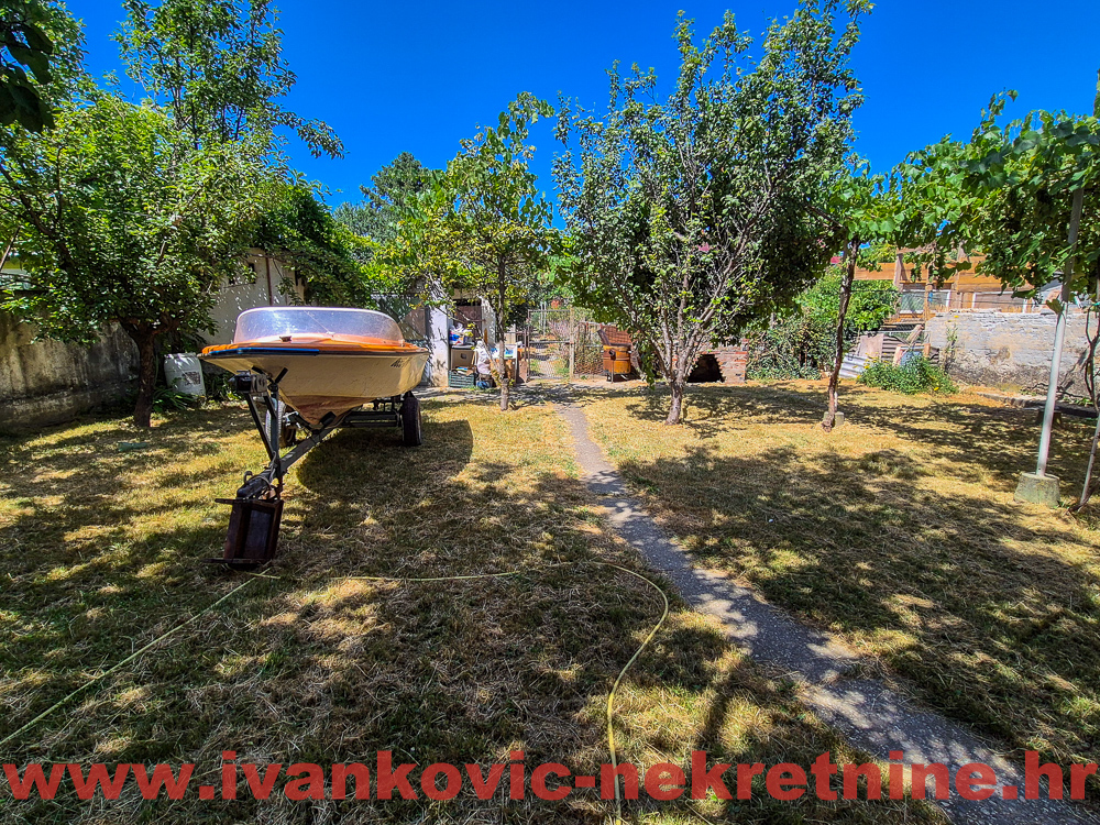 Dvorište kompletno ograđeno i podijeljeno na 2 dijela. U prednjem dijelu se nalazi prostor za terasu, garaža i pomoćna prostorija.
